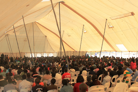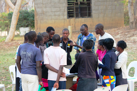 The arts were woven seamlessly throughout the three days. The evening artistic presentations included collective singing, skits, dancing, poetry, and drumming. Youth from Zimbabwe performed a traditional dance, while a group from Zambia shared a song about relying on God’s assistance in our efforts to serve. The sound of clapping, applause, and cheers of encouragement could be heard every evening from the large tent set up on the Institute grounds. Staff from the school, who were intrigued and drawn to the energy of the youth, watched many of the presentations with admiration.