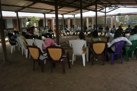 Participants gathered outdoors for plenary sessions in the mornings and evenings