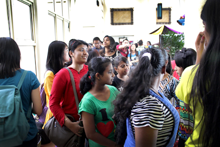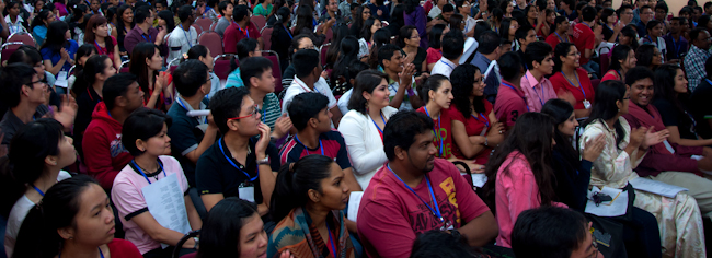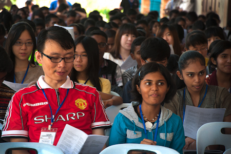The main hall was unable to cope with the overflow of participants and many were led to a space nearby, well equipped with chairs and a live video feed. While they waited with anticipation for the programme to start, a video of the youth conferences that have been taking place around the world was shown, and the participants applauded and cheered at photos of friends from the conference in Bidor that had taken place the week before. The opening ceremony took off with youth entering the hall performing a traditional stick dance accompanied by a style of music that fused a diversity of genres. The conference theme song named "Belia Boleh" ("Youth Can") followed, and there was a devotional period with prayers and songs in English, Malay, Mandarin, and Tamil.
